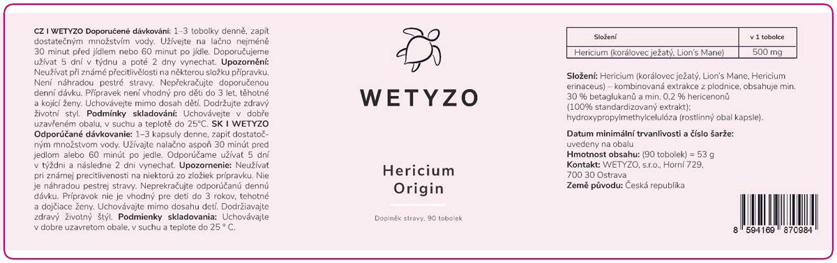 Proto u WETYZO Hericium Origin vždy najdete jasnou standardizaci: extrakt z plodnice obsahuje min. 30 % 1,3/1,6- beta-glukanů a min. 0,2 % hericenonů (100% standardizovaný extrakt; hodnoty ověřené nezávislými laboratorními testy, certifikáty.